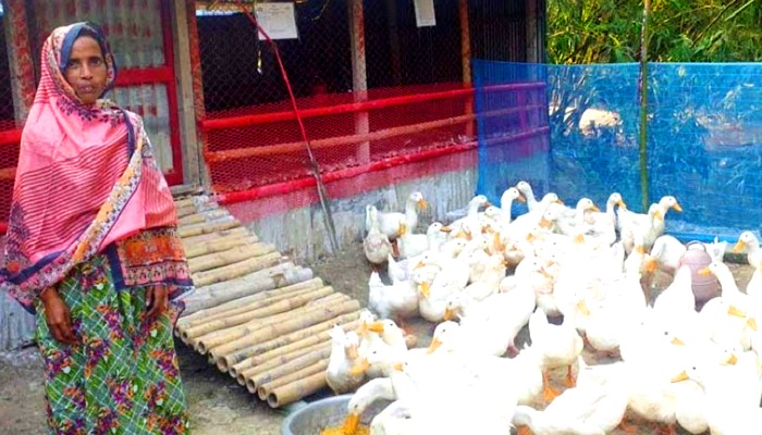 পেকিন হাঁস পালনের খামার করে দারিদ্র্যতাকে জয় করেছেন জয়পুরহাটের ক্ষেতলাল উপজেলার প্রত্যন্ত অঞ্চল বাঘোপাড়া গ্রামের রোকেয়া বেগম।