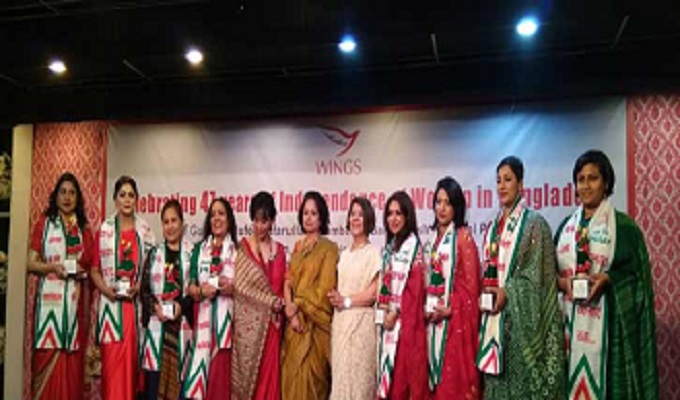 পিছিয়ে পড়া নারীদের এগিয়ে নেওয়ার প্রয়াসে কাজ করা বেসরকারি প্রতিষ্ঠান ‘উইংস’ এর আয়োজনে ‘স্বাধীনতার ৪৭ বছরে বাংলাদেশে নারী’ শীর্ষক অ্যাওয়ার্ড প্রদান অনুষ্ঠানে দেশের উন্নয়নে ভূমিকা রাখা ১৩ নারীকে সম্মাননা দেওয়া হয়। বুধবার সন্ধ্যায় রাজধানীর গুলশান ক্লাবে এ অনুষ্ঠানের আয়োজন করা হয়।
