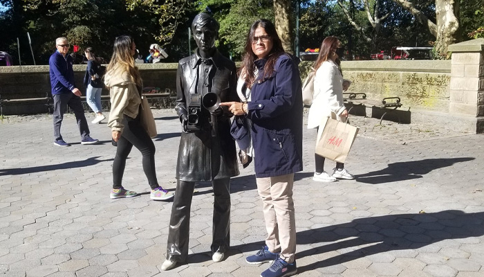 সেন্ট্রাল পার্কে যাবো। ম্যানহাটনের ফিফথ অ্যাভিনিউর ফিফটি নাইন পাতাল রেল স্টেশনে নামলাম। দু’কদম হেঁটে সেন্ট্রাল পার্কের গেটের সামনে দাঁড়াতেই প্রথমে আমার দৃষ্টি কাঁড়লো এক নারীমূর্তি। সনাতন স্টাইলের একটি বিশাল ক্যামেরা হাতে দাঁড়িয়ে আছেন সেই নারী। ফুল সাইজের এক ব্রোঞ্জমূর্তি। কে সে! আমি তো আতিপাতি খুঁজছি তার পরিচয়। মাথার ওপর খাড়া সূর্য, প্রচন্ড রোদ। ব্রোঞ্জমূর্তিটির ছবি তুলতে ব্যস্ত আমি।
