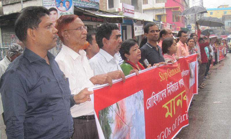 মিয়ানমারের রাখাইন প্রদেশে নারী-শিশুসহ অবাদে রোহিঙ্গা গণহত্যার প্রতিবাদে ফরিদপুরে বিভিন্ন বেসরকারি সংস্থাসমূহ (এনজিও) মানববন্ধন করেছে। সোমবার বিকেলে ফরিদপুর প্রেসক্লাবের সামনের মুজিব সড়কে এ কর্মসূচিতে বিভিন্ন এনজিওকর্মীসহ বিভিন্ন শ্রেণি পেশার প্রতিনিধিরা অংশ নেন।
