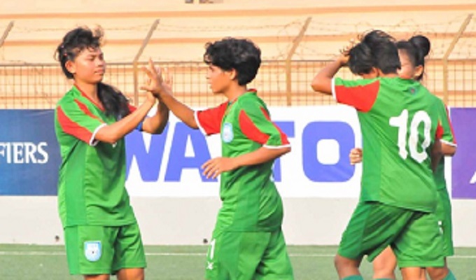 ঢাকায় এএফসি অনূর্ধ্ব–১৬ বাছাইপর্বের খেলায় সোমবার বাহরাইনকে ১০-০ গোলে হারিয়ে উড়ন্ত সূচনা করেছে বাংলাদেশের মেয়েরা। ম্যাচের প্রথমার্ধে ৫টি ও দ্বিতীয়ার্ধে বাহরাইনের জালে ৫টি গোল দেয় মেয়েরা। এর মধ্য দিয়ে বড় জয়ে এএফসি অনূর্ধ্ব-১৬ চ্যাম্পিয়নশিপের বাছাই শুরু করল বাংলাদেশ।