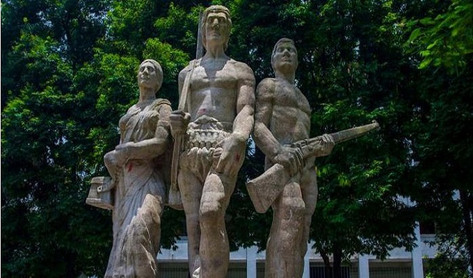 অপরাজেয় বাংলা: ঢাকা বিশ্ববিদ্যালয়ের কলা ভবনের সামনে বন্দুক কাঁধে দাঁড়িয়ে থাকা তিন নারী-পুরুষের ভাস্কর্য যেটি সর্বস্তরের মানুষের স্বাধীনতা সংগ্রামে অংশগ্রহণ নিশ্চিত করে সেটি 'অপরাজেয় বাংলা'। এর তিনটি মূর্তির একটির ডান হাতে দৃঢ় প্রত্যয়ে রাইফেলের বেল্ট ধরা বৃহত্তর জনগোষ্ঠীর প্রতিনিধি। এর মডেল ছিলেন আর্ট কলেজের ছাত্র মুক্তিযোদ্ধা বদরুল আলম বেনু। থ্রি নট থ্রি রাইফেল হাতে সাবলীল ভঙ্গিতে দাঁড়ানো অপর মূর্তির মডেল ছিলেন সৈয়দ হামিদ মকসুদ ফজলে। আর নারী মূর্তির মডেল ছিলেন হাসিনা আহমেদ। ১৯৭৯ সালের ১৯ জানুয়ারি পূর্ণোদ্যমে অপরাজেয় বাংলার নির্মাণ কাজ শুরু হয়। ১৯৭৯ সালের ১৬ ডিসেম্বর সকাল ৯টায় এ ভাস্কর্যের উদ্বোধন করা হয়। তবে অপরাজেয় বাংলার কাছে ভাস্করের নাম খচিত কোন শিলালিপি নেই। স্বাধীনতার এ প্রতীক তিলে তিলে গড়ে তুলেছেন গুণী শিল্পী ভাস্কর সৈয়দ আব্দুল্লাহ খালিদ। ঢাকা বিশ্ববিদ্যালয়ের কলা ভবনের সামনের বেদিতে দাঁড়ানো তিন মুক্তিযোদ্ধার প্রতিচ্ছবি যেন অন্যায় ও বৈষম্য দূর করে দেশে সাম্য প্রতিষ্ঠার গান গাইছে। এ ভাস্কর্যে সব শ্রেণির যোদ্ধার প্রতিচ্ছবি তুলে ধরা হয়েছে।
