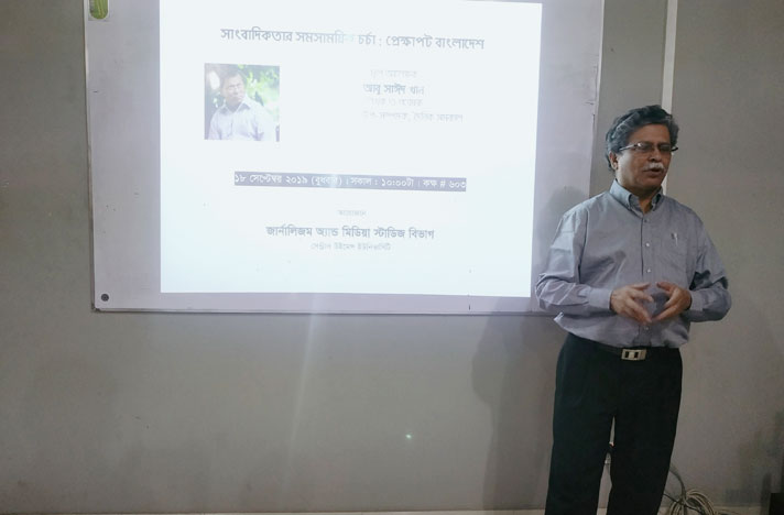 সেন্ট্রাল উইমেন্স ইউনিভার্সিটিতে সেমিনারে বক্তব্য দিচ্ছেন সাংবাদিক আবু সাঈদ খান।