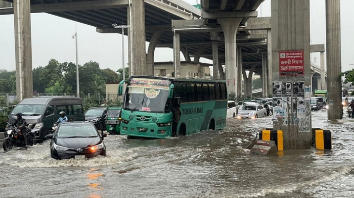 কাজী নজরুল ইসলাম এভিনিউতে মূল সড়কের একাংশ পানিতে ডুবে থাকতে দেখা গেছে। ফলে গাড়িগুলোকে রাস্তার একপাশ দিয়ে চলতে দেখা গেছে। এতে যানজট হয়েছে।