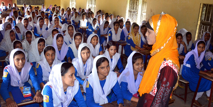 স্কুলের ফাঁকে ছাত্রীদের সঙ্গে বাল্য বিয়ের কুফল নিয়ে আলোচনা করছেন রেহানা খাতুন। ছবিটি খরনা নাদুরপুকুর ইসলামিয়া উচ্চ বিদ্যালয় থেকে তোলা।