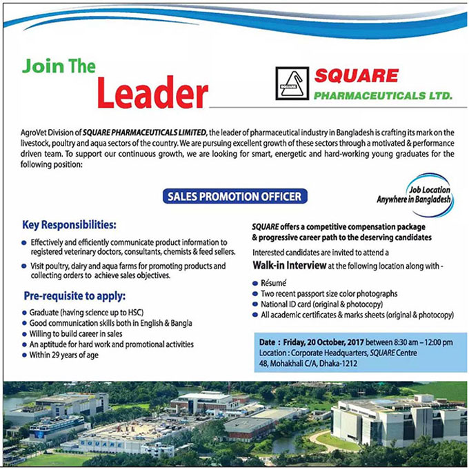 আগ্রহী প্রার্থী তাঁর জীবনবৃত্তান্ত, দুই কপি পাসপোর্ট সাইজের রঙিন ছবি, জাতীয় পরিচয়পত্রের ফটোকপি এবং সকল শিক্ষাগত সার্টিফিকেট ও নম্বরপত্রের ফটোকপিসহ ‘করপোরেট হেডকোয়ার্টার্স, স্কয়ার সেন্টার ৪৮, মহাখালী সি/এ, ঢাকা-১২১২’ এই ঠিকানায় সকাল সাড়ে ৮টা থেকে দুপুর ১২টার মধ্যে উপস্থিত হতে হবে।