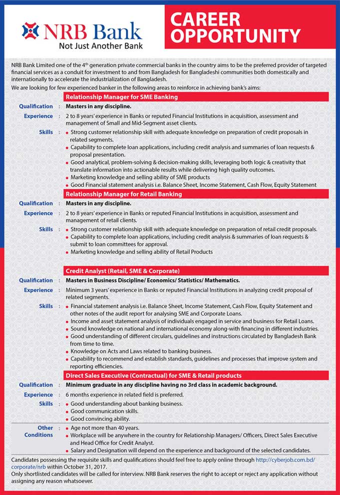 আগ্রহী প্রার্থীরা cyberjob.com.bd/corporate/nrb এই ঠিকানায় অনলাইনে আবেদন করতে পারবেন।